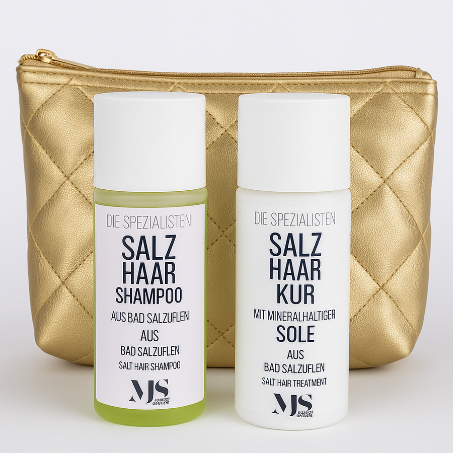 Entdecken Sie die Heilkraft der Sole aus den Tiefen der Erde – jetzt in einem praktischen Reise-Set für gesundes, kräftiges und glänzendes Haar. Das Set besteht aus einer eleganten kleinen Goldbag mit je 50 ml Salz-Shampoo und 50 ml Salz-Haarkur – perfekt für unterwegs und zum Kennenlernen.