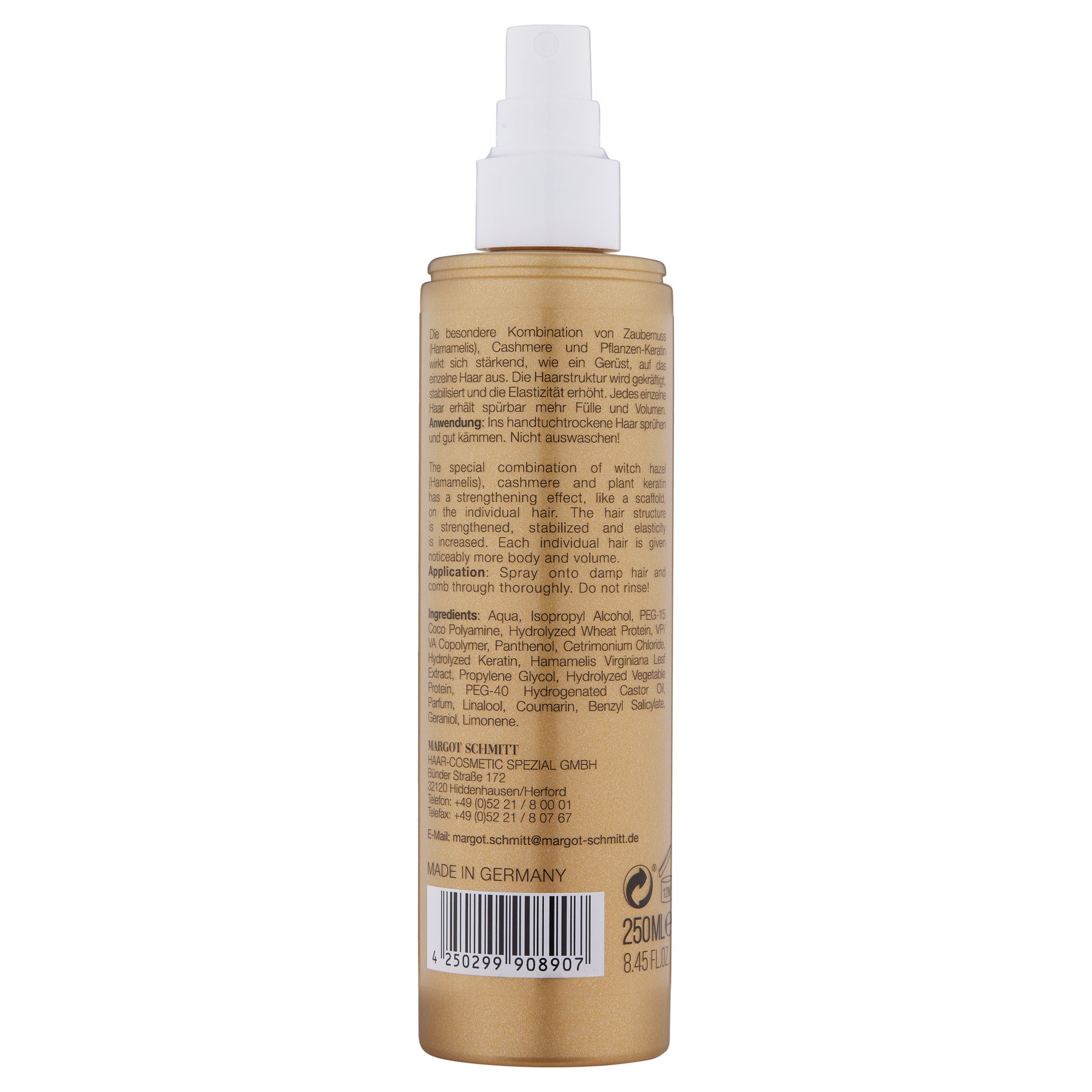 Die besondere Kombination von Zaubernuss (Hamamelis), Cashmere und Pflanzen-Keratin wirkt sich stärkend, wie ein Gerüst, auf das einzelne Haar aus. Die Haarstruktur wird gekräftigt, stabilisiert und die Elastizität erhöht. Jedes einzelne Haar erhält spürbar mehr Fülle und Volumen.