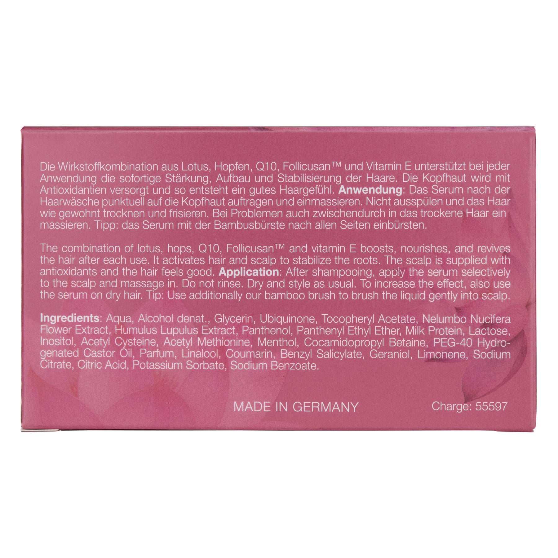 Die Wirkstoffkombination aus Lotus, Hopfen, Q10, Follicusan™ und Vitamin E stärkt bei jeder Anwendung das Haar, baut es auf und stabilisiert es. Kopfhaut und Haarwurzel werden aktiviert und angeregt. Lotus und Hopfen können das Haar stärken, Follicusan™ aktiviert die Haarwurzel und Q10 kann die Keratinproduktion unterstützen. Vitamin E schenkt Kraft und Energie. Das Serum wird nach der Haarwäsche punktuell auf die Kopfhaut aufgetragen und einmassiert und verbleibt im Haar.