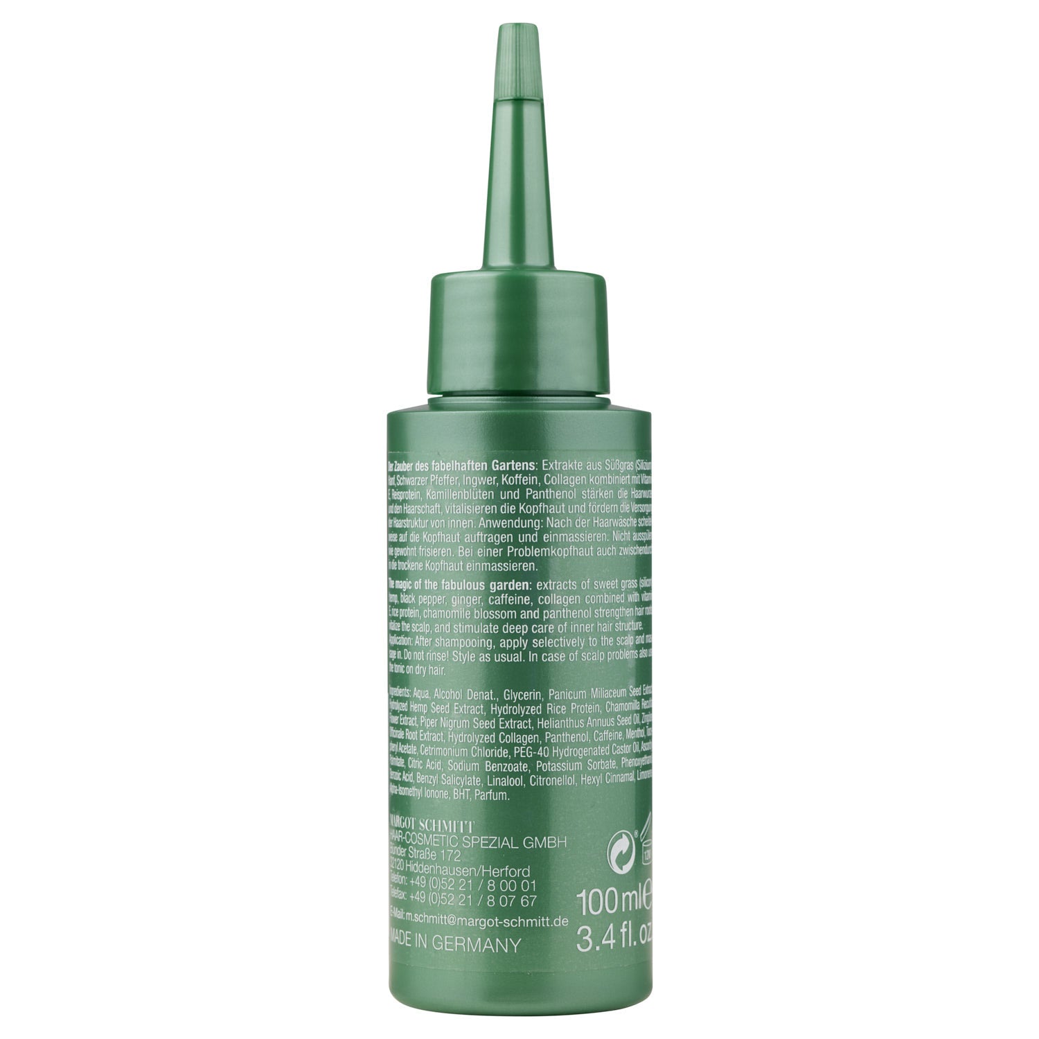 Der Zauber des fabelhaften Gartens: Extrakte aus Süßgras (Silizium), Hanf, Schwarzer Pfeffer, Ingwer, Koffein, Collagen kombiniert mit Vitamin E, Reisprotein, Kamillenblüten und Panthenol stärken die Haarwurzel und den Haarschaft, vitalisieren die Kopfhaut und fördern die Versorgung der Haarstruktur von innen.